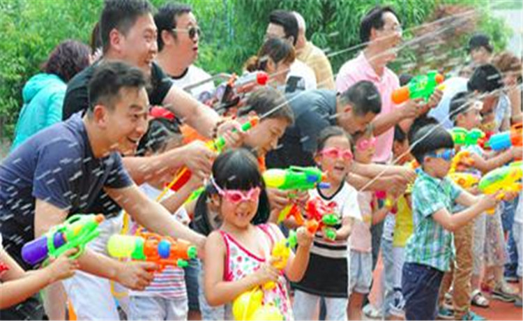 2、活動說明:爸爸或者媽媽背著孩子在指定場地內由孩子拿著水槍進行水槍射擊其他團隊的孩子背上的遇水變色的名牌;